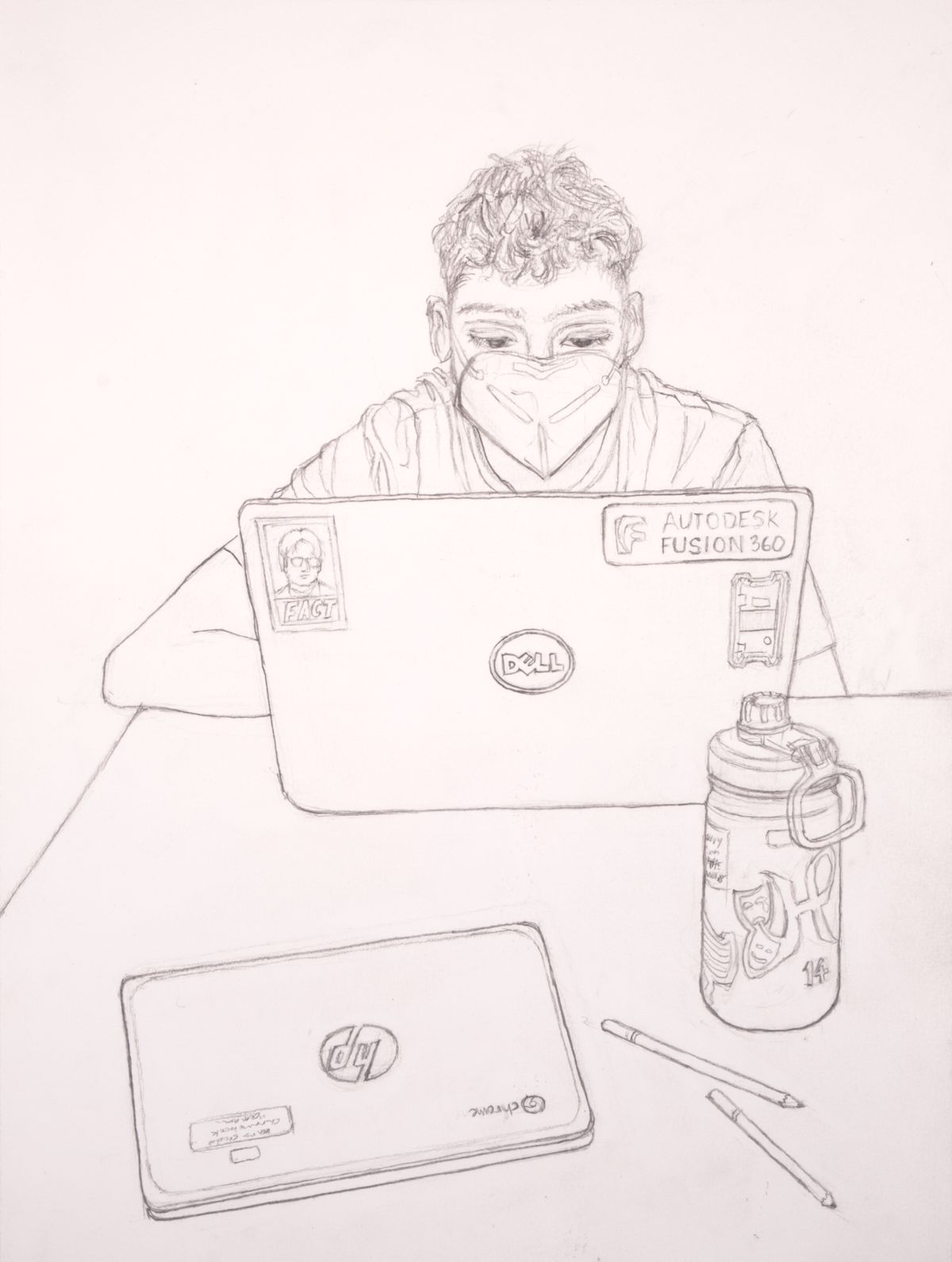 This piece was self-directed and drawn from direct observation. I was looking for opportunities to practice drawing portraits from life, and the most obvious subject was my friend Ari. He and I share a free period in our school schedule, and I spend almost an hour sitting across from him every day while we chat and work on schoolwork. I added a few objects to the foreground to help capture a snapshot of my daily life.