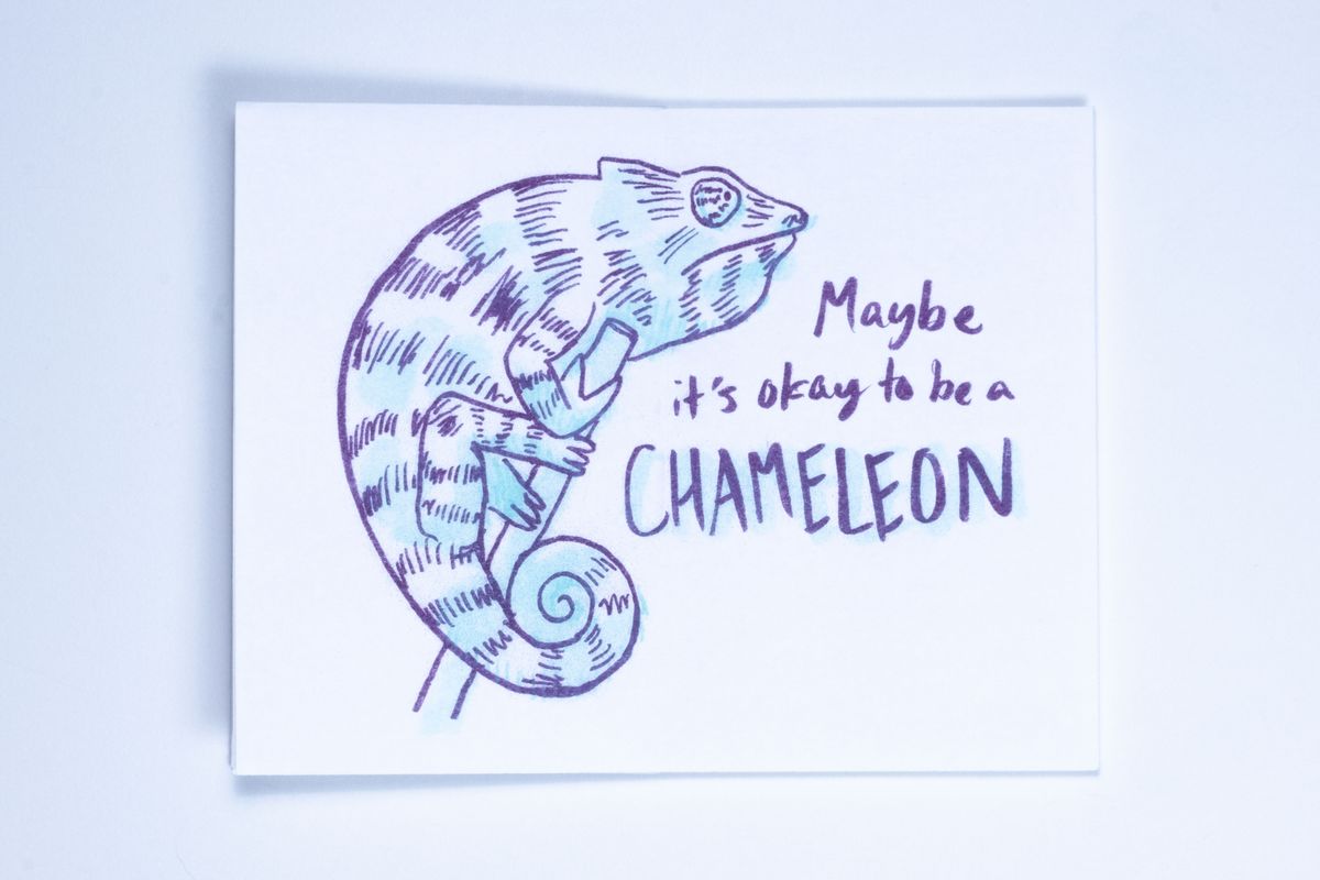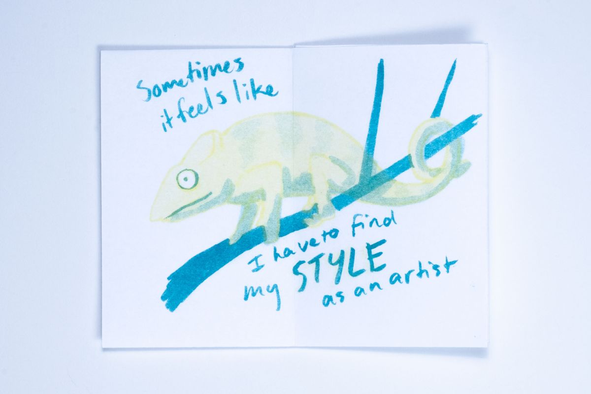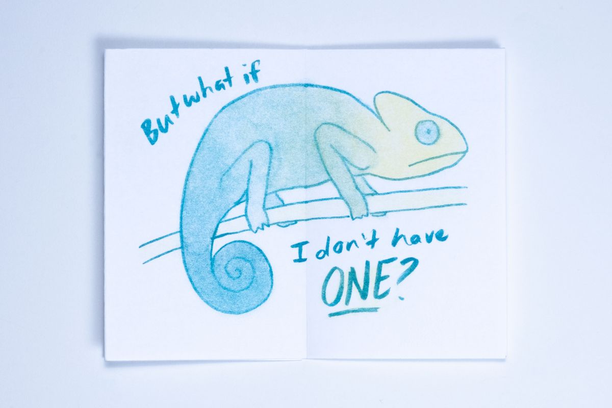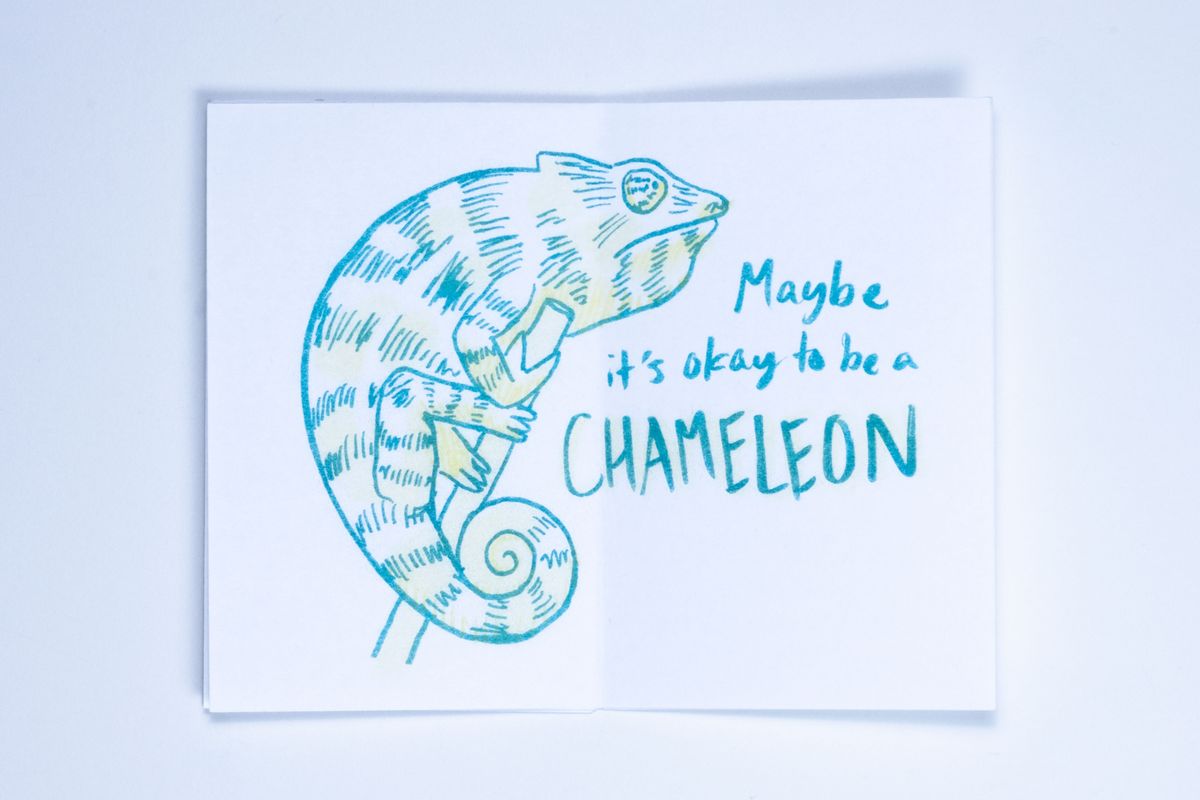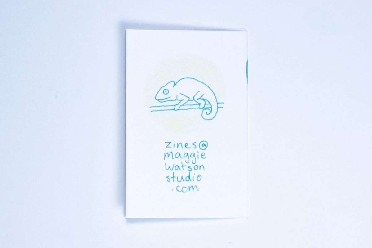 I often struggle with the idea that to be a successful artist, I must "find my style." Many of the professional artists I admire have a clear and consistent look to their artwork, but I have always had a multitude of different styles and techniques that I shift between. I've been encouraged by art teachers and mentors to embrace this as a skill and not a failing, and have come to think of myself as an artistic chameleon, shifting between styles to match my environment. This zine is a representation of that idea.