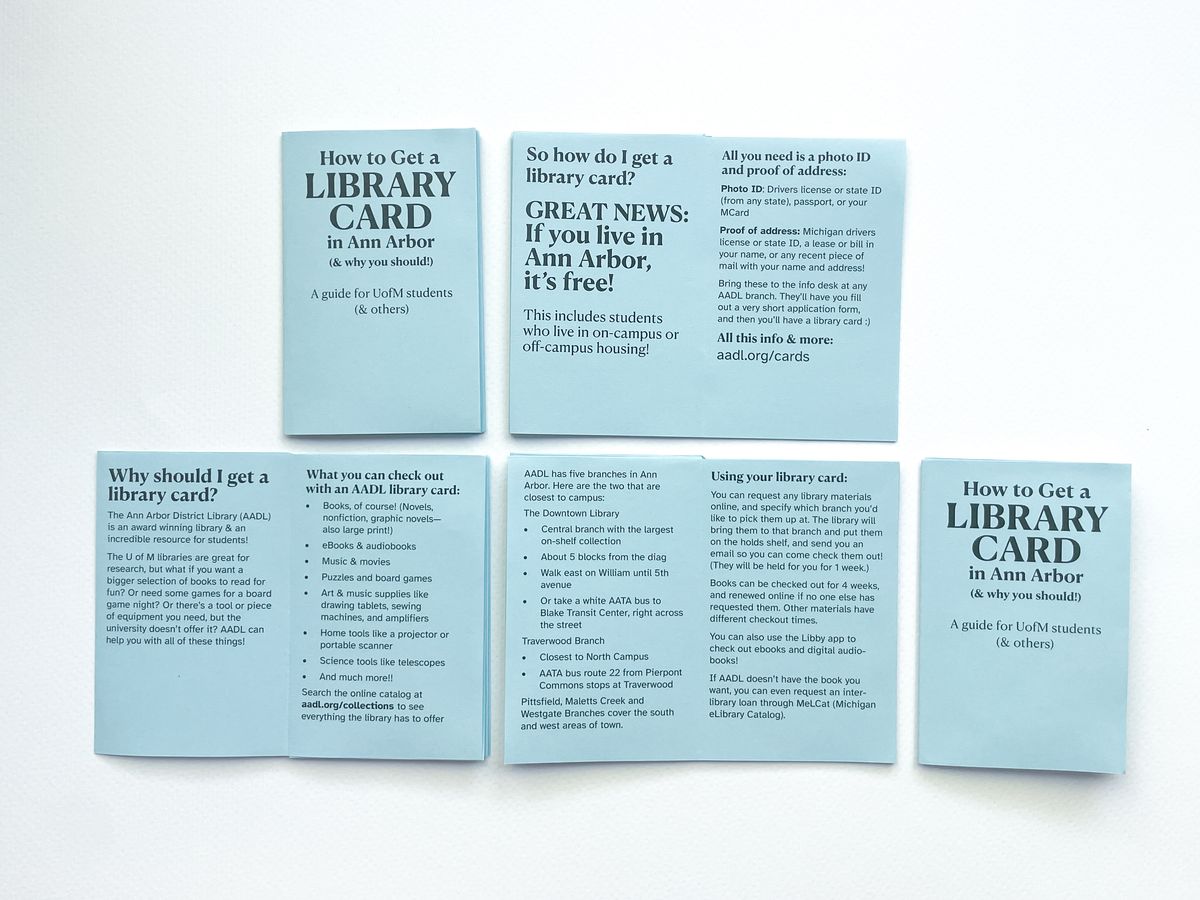 As a University of Michigan student who grew up in Ann Arbor, I have always been surprised by how few students know about and take advantage of our wonderful library! This is one of my few attempts at a purely informational zine. It's intended to be a simple, clear and enthusiastic pitch for why my fellow students should get an AADL card and use it. I've released it under CC BY-NC 4.0, so anyone can copy and distribute it.