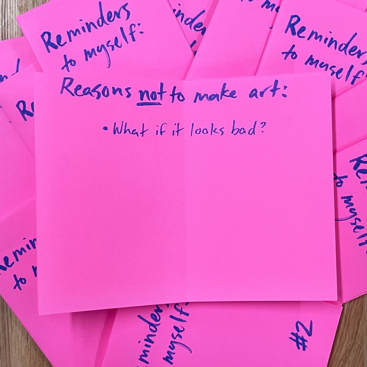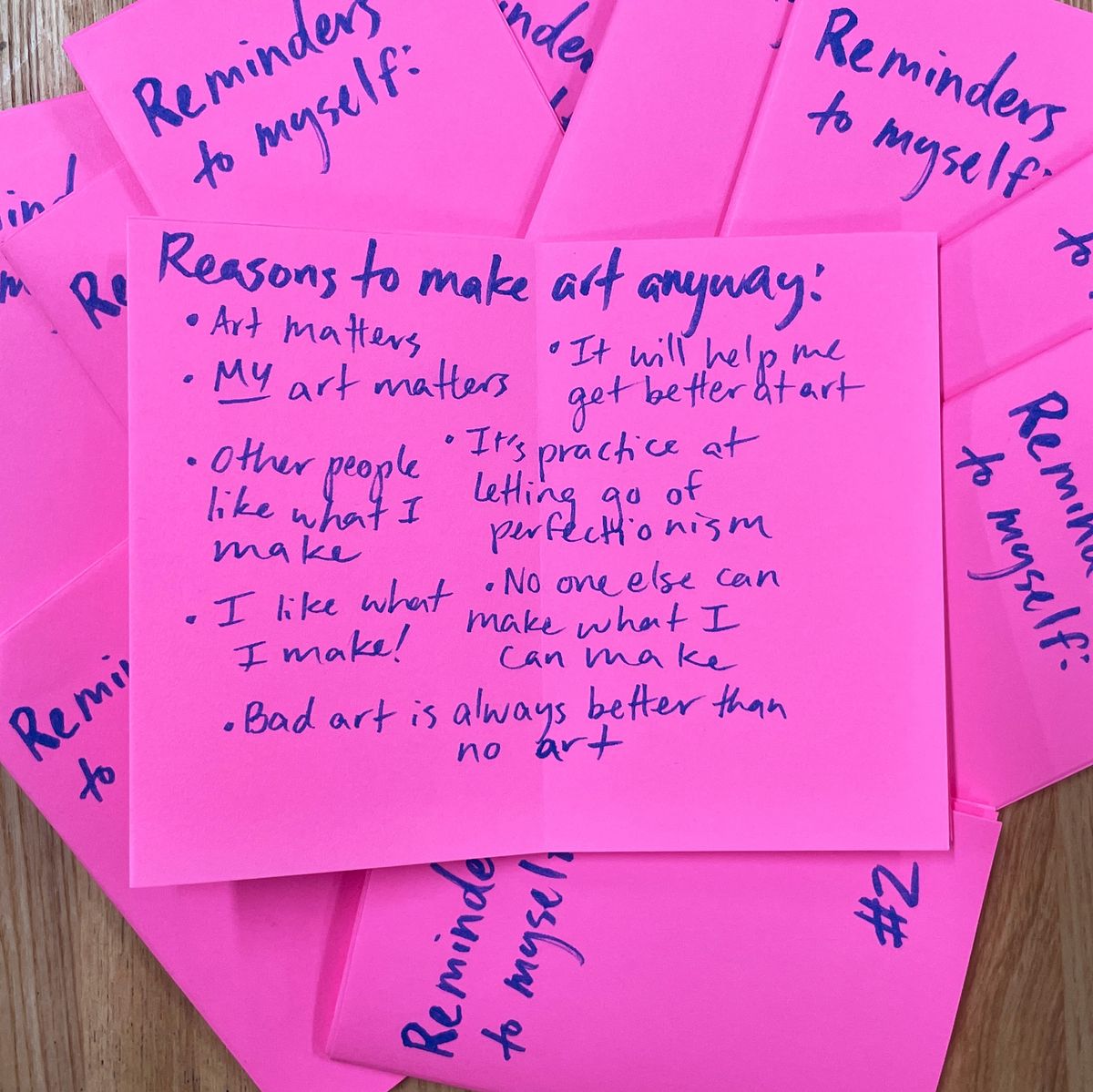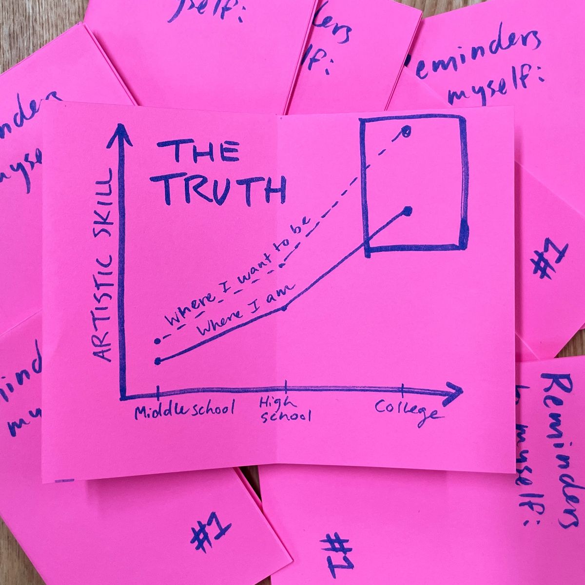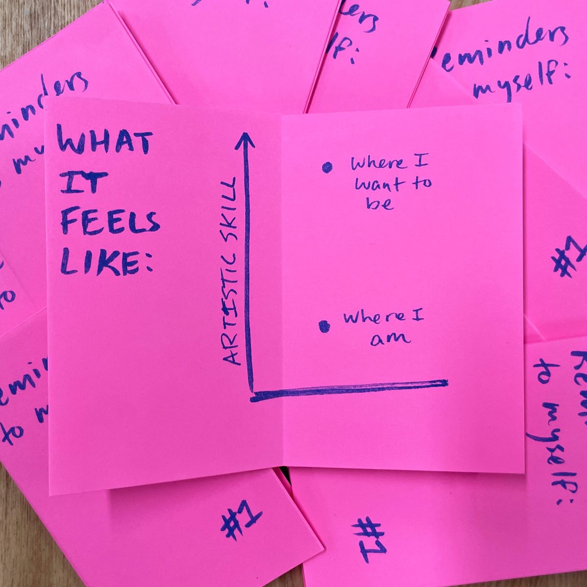 I often struggle with perfectionism when it comes to my art. Zines are a medium I find freeing because they can be simple, messy and low stakes, while still communicating real emotion. This series of three zines are a set of reminders to myself—of how far I've come, why I love to make art, and how it doesn't have to be perfect to be worth doing.