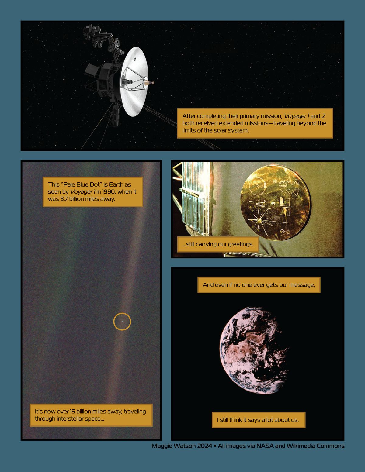 I've always loved the story of the Voyager Golden Record—the idea that we as humans decided to send a message out into space to introduce ourselves and say hello, just in case anyone was listening. "The Sounds of Earth," titled after the Golden Record's official title, is a short nonfiction photocomic telling the story of the record and the Voyager program. Many of the photos included are actual photos that were encoded on the records. With the design, I hoped to match the aesthetic of the vintage photographs and take inspiration from educational comics in children's science magazines I read as a kid, such as Highlights and Ranger Rick.