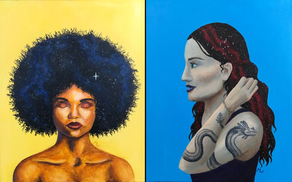Venus and Andromeda are the first paintings in an ongoing self-directed series. I am exploring the overlap between mythology and astronomy, as well as reimagining mythological women from a modern, intersectional feminist perspective. I chose to depict Venus differently than the way she is depicted in classical art, to challenge historical standards of beauty. Likewise, I portrayed Andromeda, traditionally a damsel in distress, as a woman capable of fighting her own monsters. This series combines several things I am passionate about—astronomy, mythology, and feminism—and I consider these to be some of my best works so far.